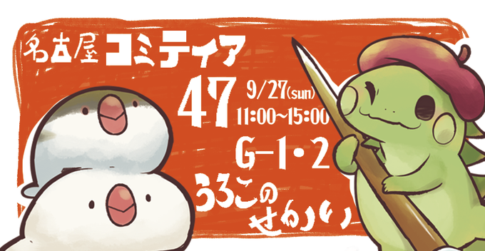 明日は国際会議場の名古屋コミティアに出るよ!出入り口すぐの配置なので、会場MAPを見るまでもなく分かると思うよ!今回もアザラシ文鳥のsailさん(@I_bukichi)をお招きしてるので、小鳥グッズも期待してねー!
