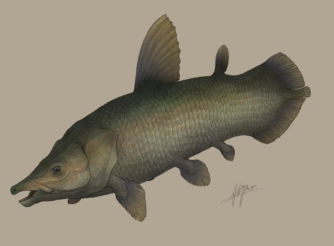 I found some time this evening to finish this off. As promised, here's the coloured version of Axelrodichthys araripensis! I went with a greenish-grey colouration since this species was likely frequenting the brackish and coastal waters of the Lower Cretaceous Araripe Basin.