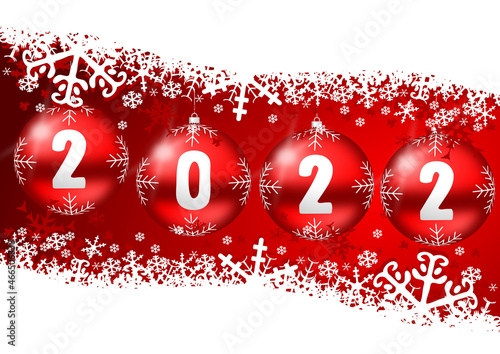 Happy new year 2022 greeting card with christmas red balls and white snowflakes, xmas background, winter illustration