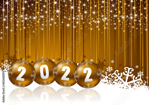 New Year's 2022 greetings card with golden christmas balls with white snowflakes