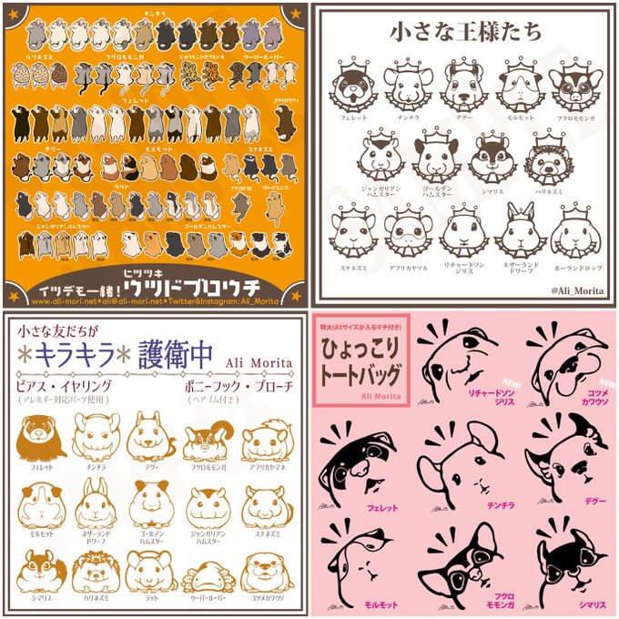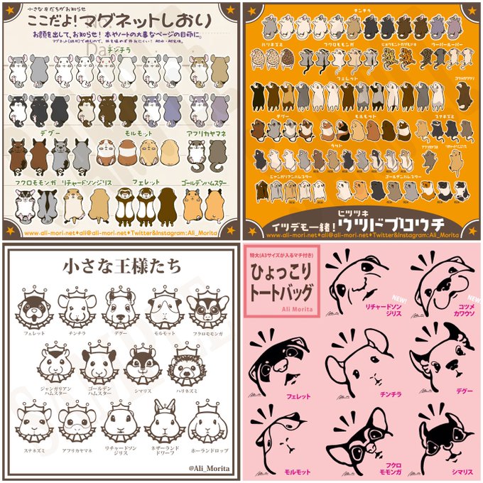 フェレット、チンチラ、デグーにフクロモモンガやモルモット等の #小動物 で参加。リチャードソンジリスやシマリス図柄も増加中。