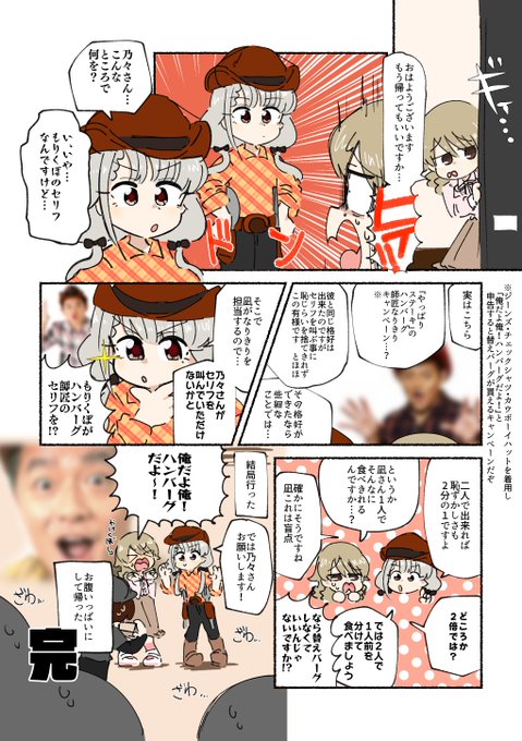ハンバーグ師匠なりきりキャンペーンに参加しようとする久川凪と、森久保乃々の漫画です