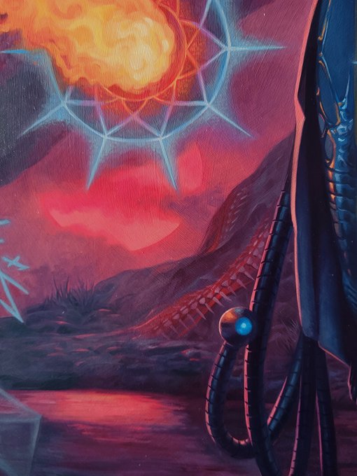 "Change the Equation" for Magic: the Gathering's March of the Machines set. Man, all that Quandrix style overlapping magic was a beast to paint in oils. The Phyrexian text reads "Surrender to Perfection."