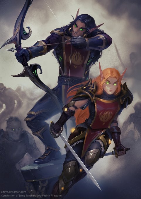Commissioned art depicting WoW characters: Esme Sunshard and Vaelrin Firestorm