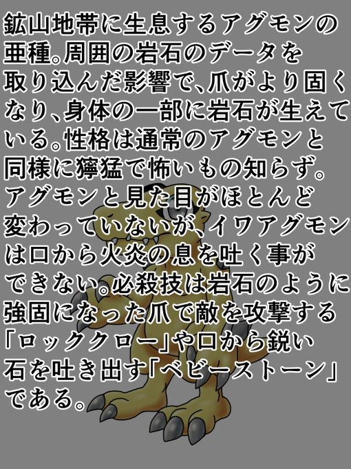 #オリデジ #オリジナルデジモン 鉱山地帯に生息するアグモンの亜種「イワアグモン」です。アグモンに比べ体色が暗く、一部に岩が生えており、炎を吐けないのが特徴です