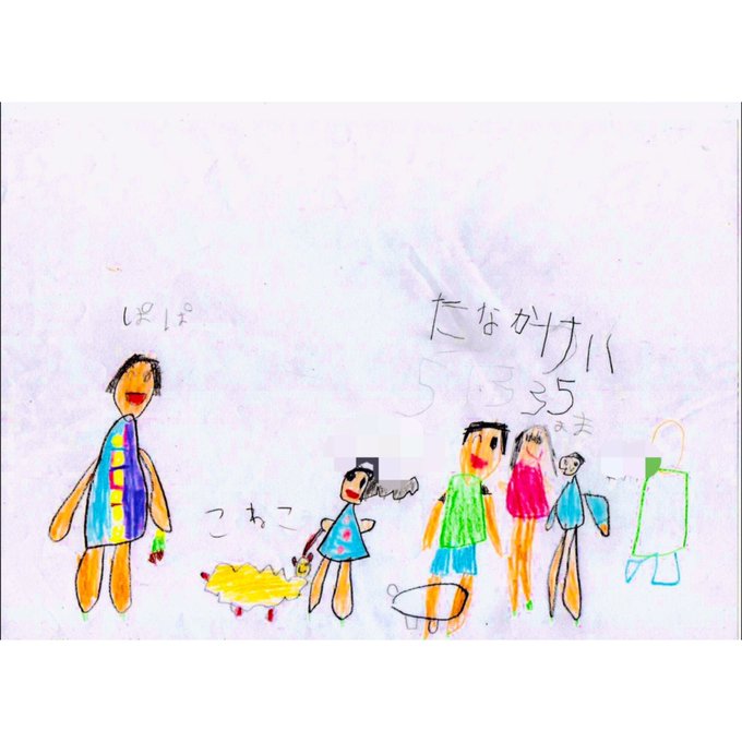 5歳の娘が描いた家族の絵。 右から息子、私、田中圭、娘、子猫 少し離れて…夫。 田中圭さんは、もはや家族の域に達したらしい。 夫の立ち位置…ドンマイ。 #田中圭 #子育て漫画