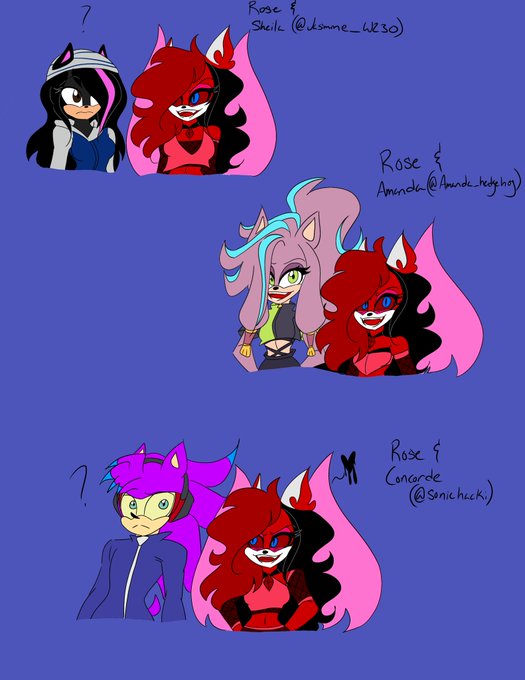 Decided to draw sonic ocs with my girl,Rose the Fox. Sheila belongs to @Jasmine_W230 Amanda belongs to @Amanda_hedgehog and Concorde belongs to @SonicHacki