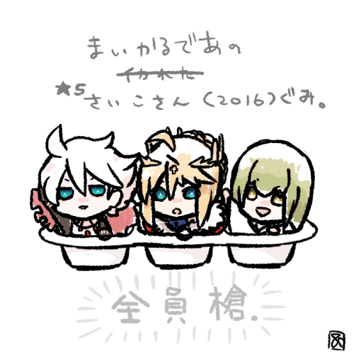 マイカルデアで最古参(2016年)の星5鯖3人組のゆるい落書き。左から本年度ようやく弟と遭えたカルナさん、どの円卓の騎士やアルトリア系よりも先にきた槍トリアさん、気づけばマイカルデア1の体力おばけと化したエルキドゥくんです。ええ、まさかの全員ランサーよ。