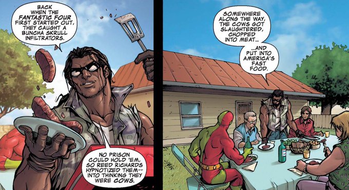 Never forget that "aliens brainwashed into cows and then made into burgers" is the longest running marvel storyline (since FF#2)