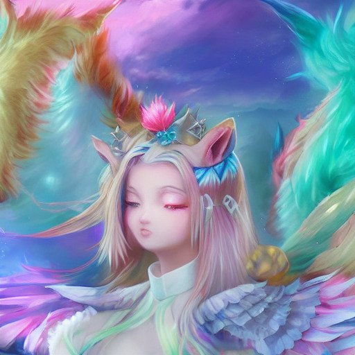 Some key words : colorful, fantasy, surrealistic highly detailed, halfbody cgi digital art, smiling, kitsune vixen princess, holy angel, spirit blossom ahri aerith, fluffy soft fox ears and hair.