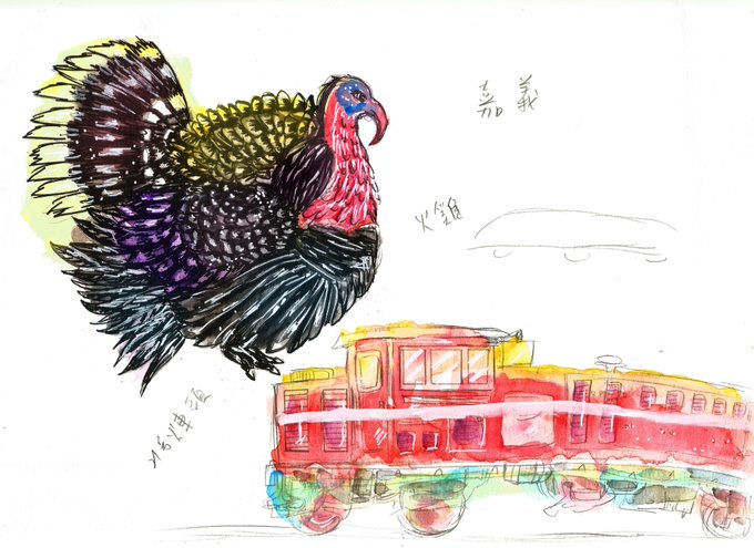 之前的嘉義明信片,自己畫的素材。 #シチメンチョウ #きしゃ #水彩絵 #素材 #ねた #はがき