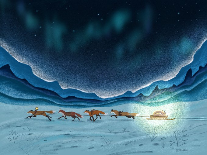 До того, как люди изобрели физику и астрономию, северным лисам приходилось собственными силами заканчивать полярную ночь, воспитывая среди своих сородичей новое солнце и отвозя его к северному полюсу. (Рисунок нам предоставила чудесная @motriarch)
