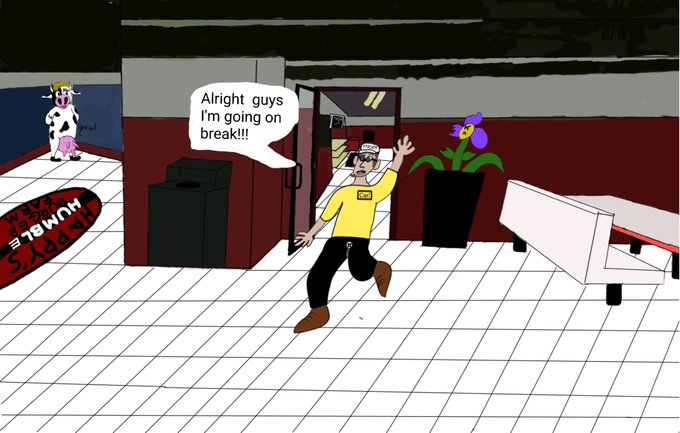 I did mention I was working on a comic. Figured I'd share it here for laughs. This is a custom piece fanart for a new indie game called Happy's Humble Burger Farm, created by @dev_scythe.