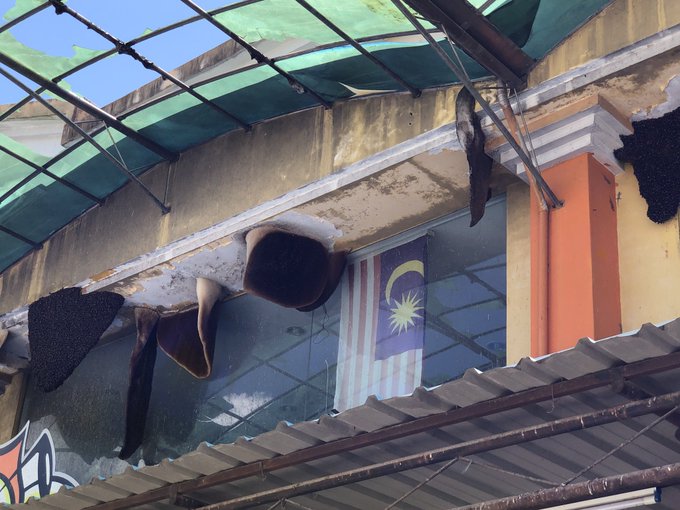 本来なら、熱帯雨林の高さ70mの突出木に巣を作るオオミツバチ。それが、商店の二階に巣を作っていました。森の伐採がより進み、オイルパームがより広がったせいで、営巣場所が無くなり、オオミツバチでさえ都市昆虫として生きていくしかないようです。Darwin comes to Town ですね。