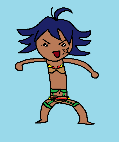her name is Bomber-chan and she's a tan tomboy with short messy blue hair and anime scars