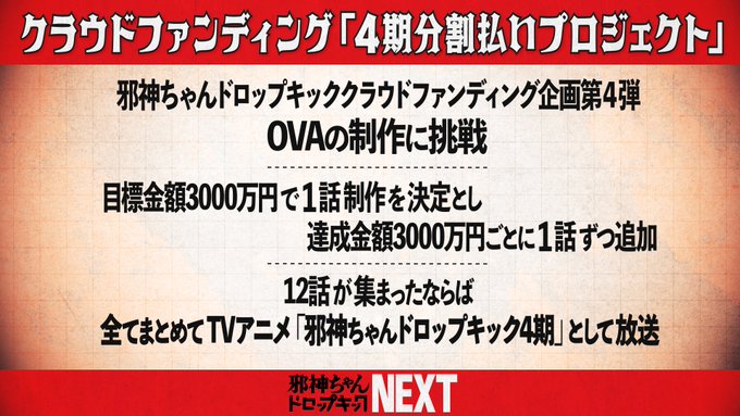 It was announced that the franchise "Jashin-chan Dropkick", will have a 4th season, but to produce an episode, a donation of 30 million yen per episode will be needed to make it happen, and so on, for a total of 12 episodes.