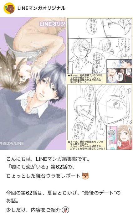 LINEマンガオリジナルの公式アカウントにて、嘘にも恋がいる62話のネームなどを紹介していただいてます😆 私のネームは本当にヒドイので恥ずかしいですが…笑 よかったら見てみてくださぃ✨ ネームの段階から下書きのように美しく書ける方ってほんと憧れます🤗