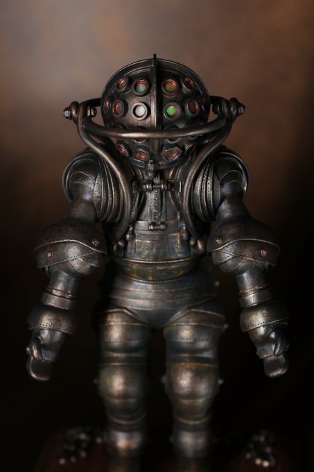 ヴィクトリア朝をイメージした台座を自作、蛇腹状のディテールやリベットは彫り直し。せっかくなので博物館展示用のライトアップ演出…のようなイメージで電飾加工、20個の覗き窓が発光するギミックを仕込んでみました。色によっては潜水服というより宇宙人のように見えて楽しいです。スチームパンク!