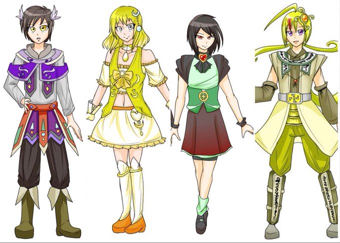 @sousakuTL #primula_stories 主要人物の立ち絵、四枚目は追加枠 二、三枚目は変身前後で性別変わるタイプです