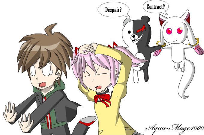Madoka and Makoto running away from Kyubey and Monokuma #danganronpa #madoka_magica
