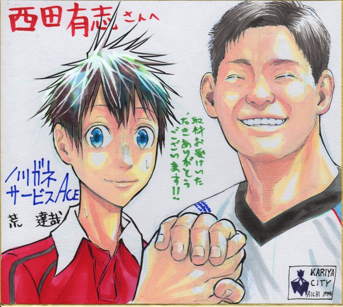 今日はチャンピオン発売日!巻頭カラー43pぶちかまします!画像は対談させていただいた西田選手に差し上げた色紙。あの輝かしいスマイルは俺の画力じゃ再現し切れなかったのでぜひアリーナにジェイテクトスティングスを見に行きましょう