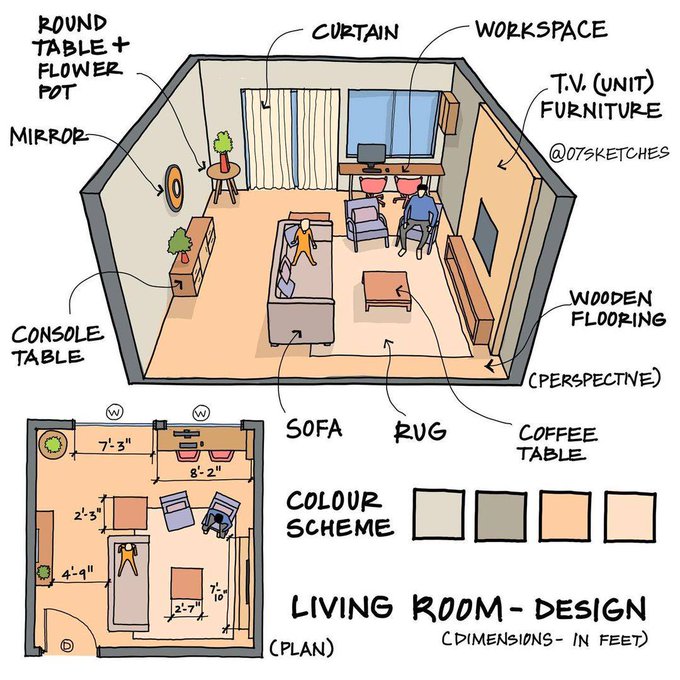Planning of a living room with correct arrangement and elements.