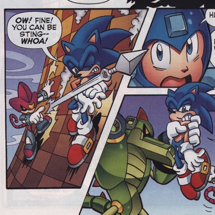 When fighting the roboticized versions of Charmy Bee and Espio in "Worlds Collide", Sonic makes a quip naming two Mega Man X characters. Those being Sting Chameleon and Blast Hornet.