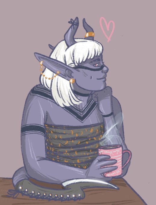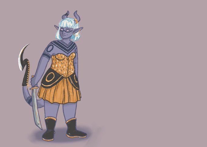This is my baby, Faith! She's a half drow half tiefling Warlock with a tail blade called 'wits end'. She's here to steal gold, food and hearts.