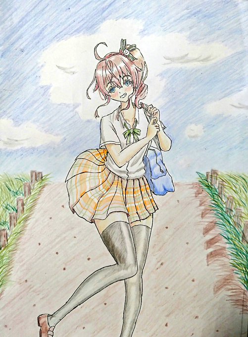 #祭絵 #ホロライブ 色鉛筆画。 まつりちゃん通学途中♪ 「早くしないとおいてくよ」 と言いつつ遅刻しても一緒に通学したい(*´ω`*)