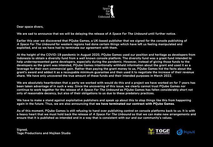 🇮🇩 Indonesian-based @togeproductions & @MojikenStudio have terminated their agreement with UK-based @PQubeGames to publish the console ver. of @ASFTUgame over disputes regarding a diversity grant previously awarded to the publisher.