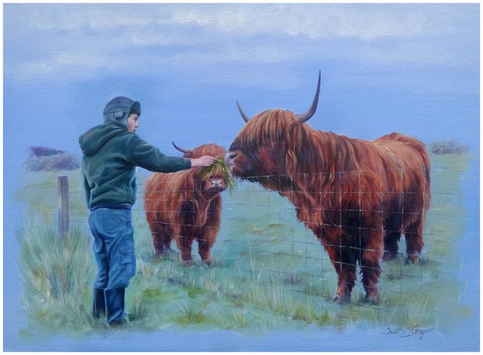 My new oil paintings of Highland Cows, my son is in painting feeding the coo #Ayrshire #oilpainting #highlandcows