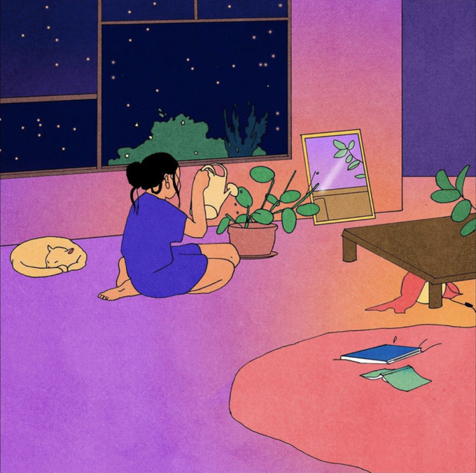 "With minimal shadows and colors, the artist effectively transforms the image into a peaceful universe that recalls Japanese woodblock prints."