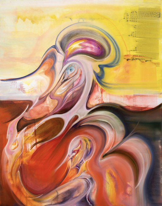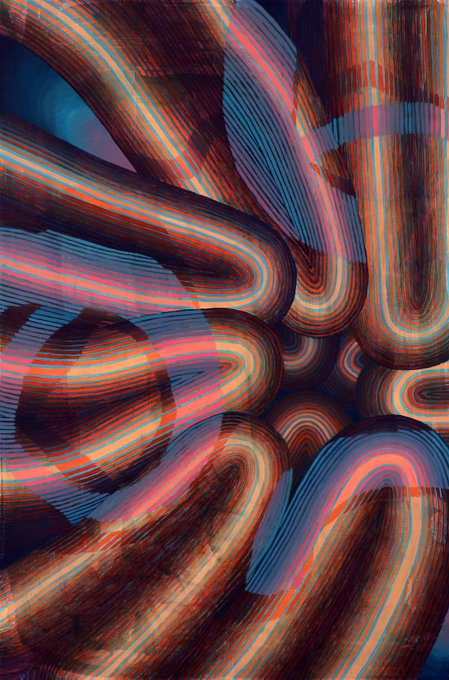 Theresa Daddezio’s paintings are filled with sinuous lines and pulsing gradations of color. Her abstracted patterns resemble the natural realm (tree trunks, petals, channels of water) as much as physical infrastructure (bundles of cables, shiny machinery): https://t.co/lEV8p9wnah