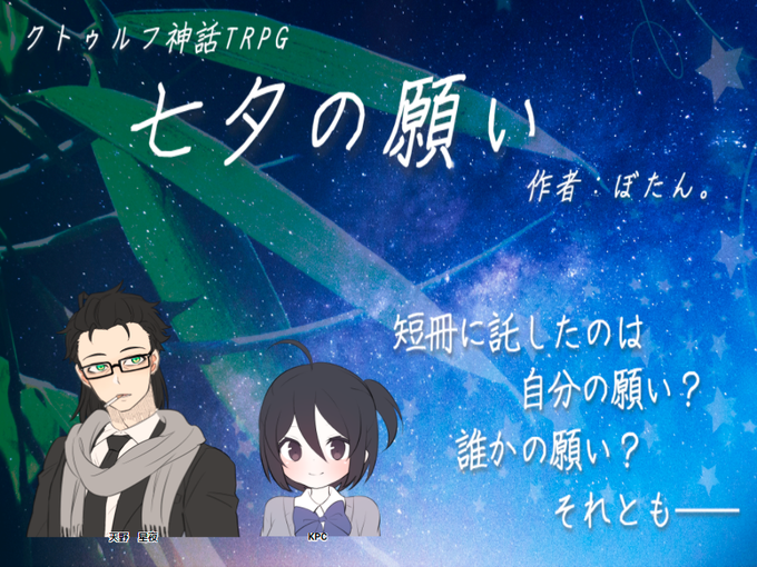 CoC「七夕の願い」ぼたん。様作 KP私 PLさくらん(天野 星夜) 作者兼見学ぼたんちゃん やっぱりしんどいな!俺もしんどかった!!分かるぞ!!!(KPの声) これからブラッシュアップのお手伝い頑張ります。 曰く作者見学アリで回されたのは初めてらしく、まさかの5年越しの快挙を成し遂げました←
