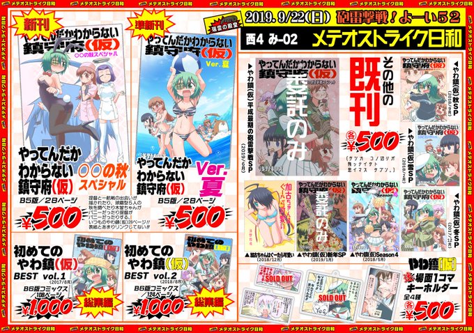 9/22(日)にビッグサイトで行われる陸海空魔合同演習に【西4ホール】【み-02】【メテオストライク日和】で参戦します!できたてほやほやの新刊(提督とあの艦娘の出会いとか球磨型の秋を調べたりする漫画)と夏コミ新刊の再版分他機関多数持っていきます!お暇なら来てよねー!!( ◜◡‾)ノ