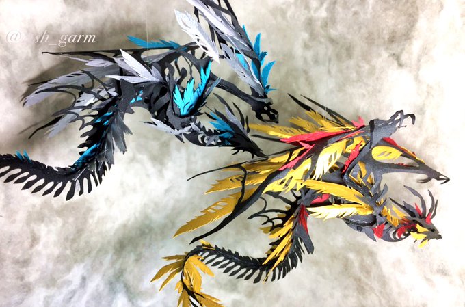 デザフェスにも置いていた、同じ形の黒い骨格と違う色の羽根をもつ2匹の飛龍です🐉