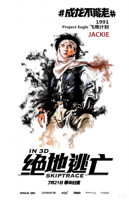 A series of SKIPTRACE posters featuring Jackie Chan's past hits: