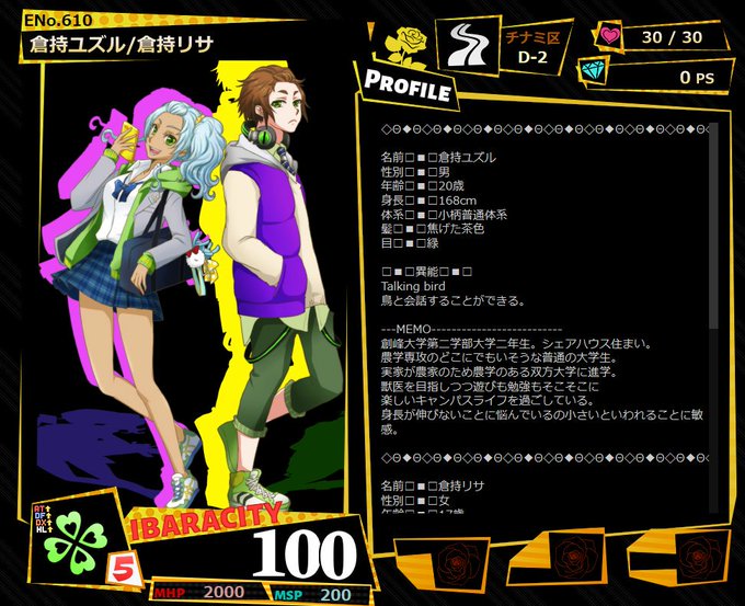 @ibr_wall CSテンプレをお借りして! ENo.610倉持ユズル/倉持リサの兄妹です! 異能はユズルが鳥と話せる能力。リサが体から花を咲かせる能力。本稼働から参加!どうぞよろしくお願いします! #荊街キャラクターシート