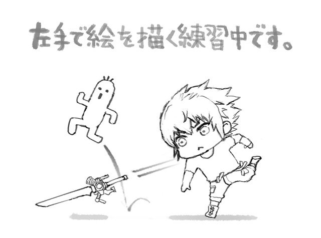 左手で絵を描く練習で、 FF15のノクトとサボテンダー描いてみました。 イグニス、グラディオ、プロンプトも追加で描く予定です。 左手で線を描くのが難しく、ラフ絵を描くまでにも すごく時間がかかりました。