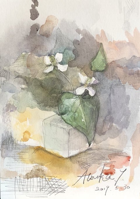 水彩で花。 いつも枯らしてしまっていた室内の植物たち。外だと虫に喰われながらも長生きしてくれてます。また植えよう。
