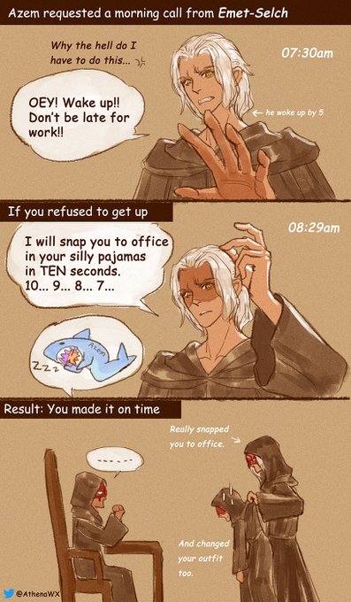 About how #EmetSelch and #Hythlodaeus wake up #Azem 😂 Which style do you prefer?