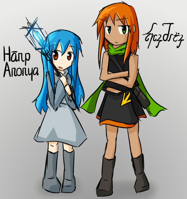 帽子なしのハープとセルドー村のエクスです。数年の間で設定が色々変わった影響により、エクスが程よく褐色化したことをここに報告いたします。文字は仮。