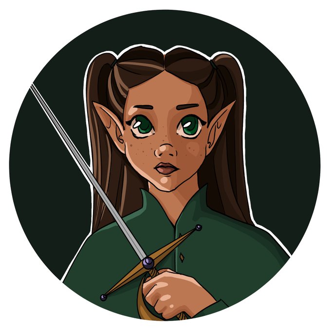 @ForbiddenSnacky Your dice are beautiful! This is Sylfina, my bladesinger. She's only (the elven equivalent of) ~13, but after her father was killed, she's traveling along with the party to exact revenge. Her favorite thing in the world (besides her dad RIP) is stories about heroes.