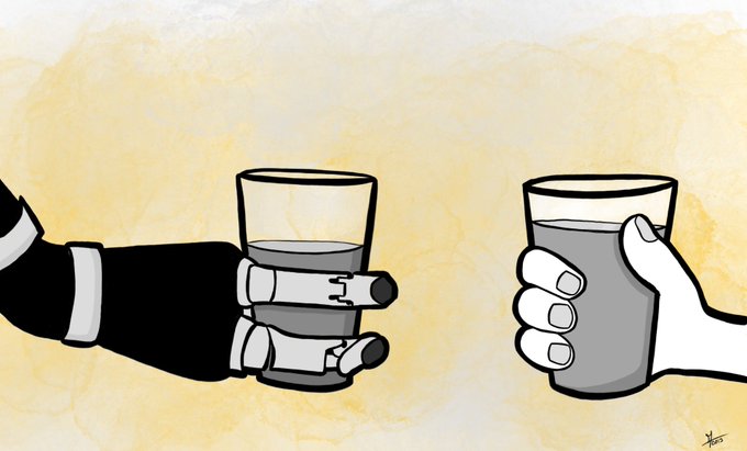 Illustration qui représente Jaco, un bras articulé qui permet à des personnes qui ont perdu l’usage de leurs mains de trinquer (entre autres !) en le pilotant depuis un joystick sur leur fauteuil roulant. #jaco #robotique #bras #innovation #futur #dessin #drawing #procreate