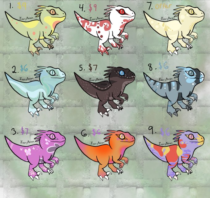 Drew some more velociraptors today! These are my original designs and Lineart, if you’d like to buy one the prices are listed on the image. I’m really tentative to sell #7, so if I don‘t get an offer I like I’ll probably keep him. #adoptables #adopts #characterdesign #openadopt