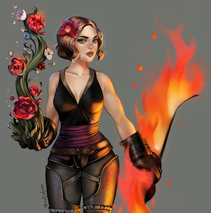My beautiful Hanna Brightwood, Druid/Ranger, symbolized by the duality of the nature abilities she uses. She can nurture and grow... but she can also set you on fire. #dungeonsanddragons