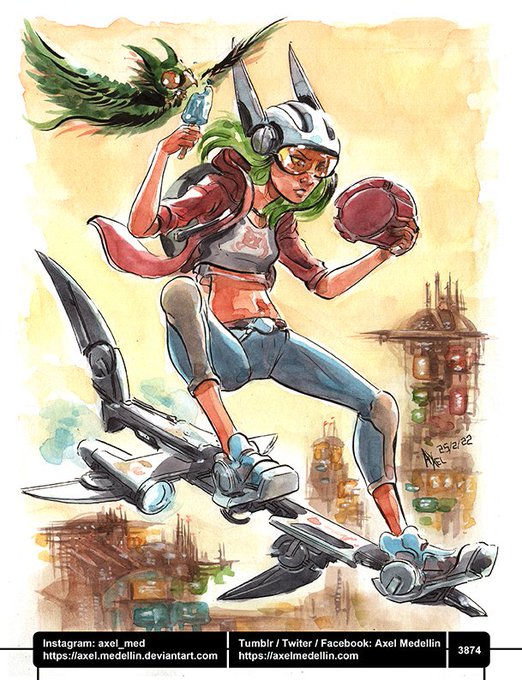 #dailydrawing 3874 #dibujodiario #drawingoftheday #HoverBoard #flying #scifigirl #sciencefictionart #oc #conceptart #futuristic #bird #popsicle #watercolor #traditionalart #brushandink