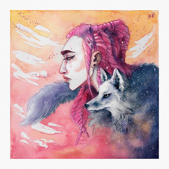 Cheveux roses, renard blanc et arthrite au doigt - Aquarelle réalisée dans la souffrance mais c’était fun à faire ! :D