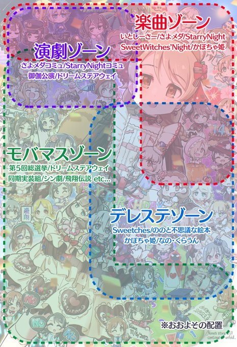 今回のイラストの登場アイドルの元ネタ解説。 総勢50人+乃々! ユニットとかのグループごとに固めつつ、共通するアイドルが所属しているグループを隣り合わせながら連鎖させる配置芸です! #森久保乃々 #森久保乃々生誕祭2023