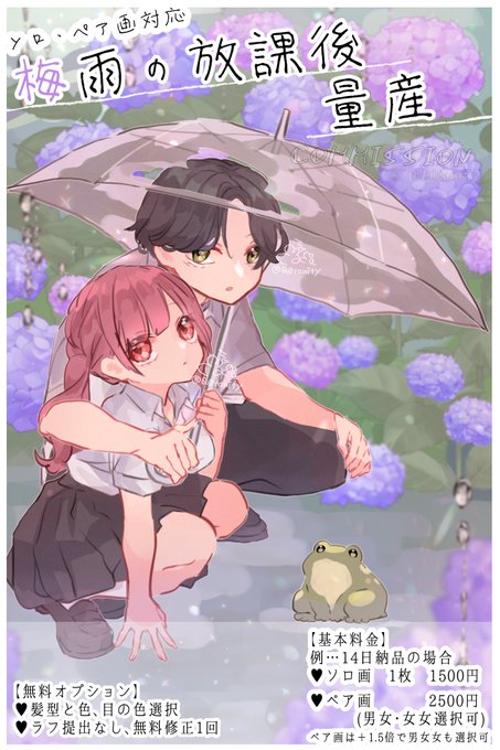 🐸 【梅雨の放課後量産】 ソロ、ペア(🚹🚺&🚺🚺)🆗 カエルなしOK、詳細ALT と2枚目 ┈┈┈┈┈┈┈┈┈┈┈┈ DMお待ちしてます🤍 ▶他量産 #もずめ量産一覧 #有償依頼 #量産依頼 #イラストオーダー #有償アイコン #有償依頼受付中 #ペア画
